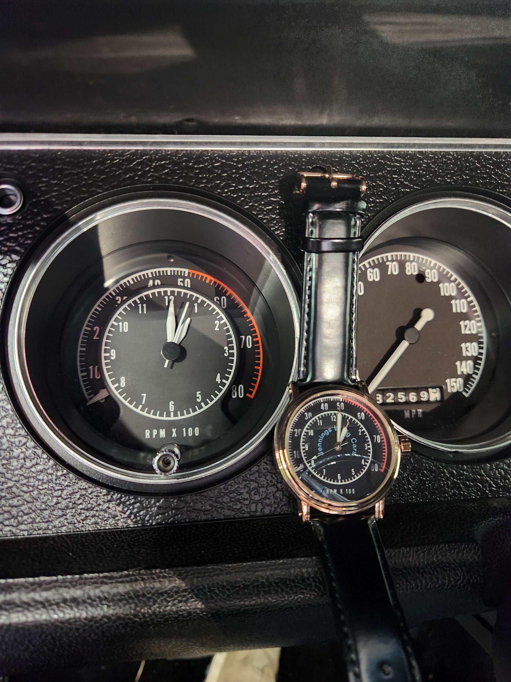 Bring some horsepower with you to the office with the Tic Toc Tach wristwatch... The black leather strap compliments the chrome bezel that frames the iconic Tic Toc Tach design! This is a very limited with the Jennings Wing Car on the dial!